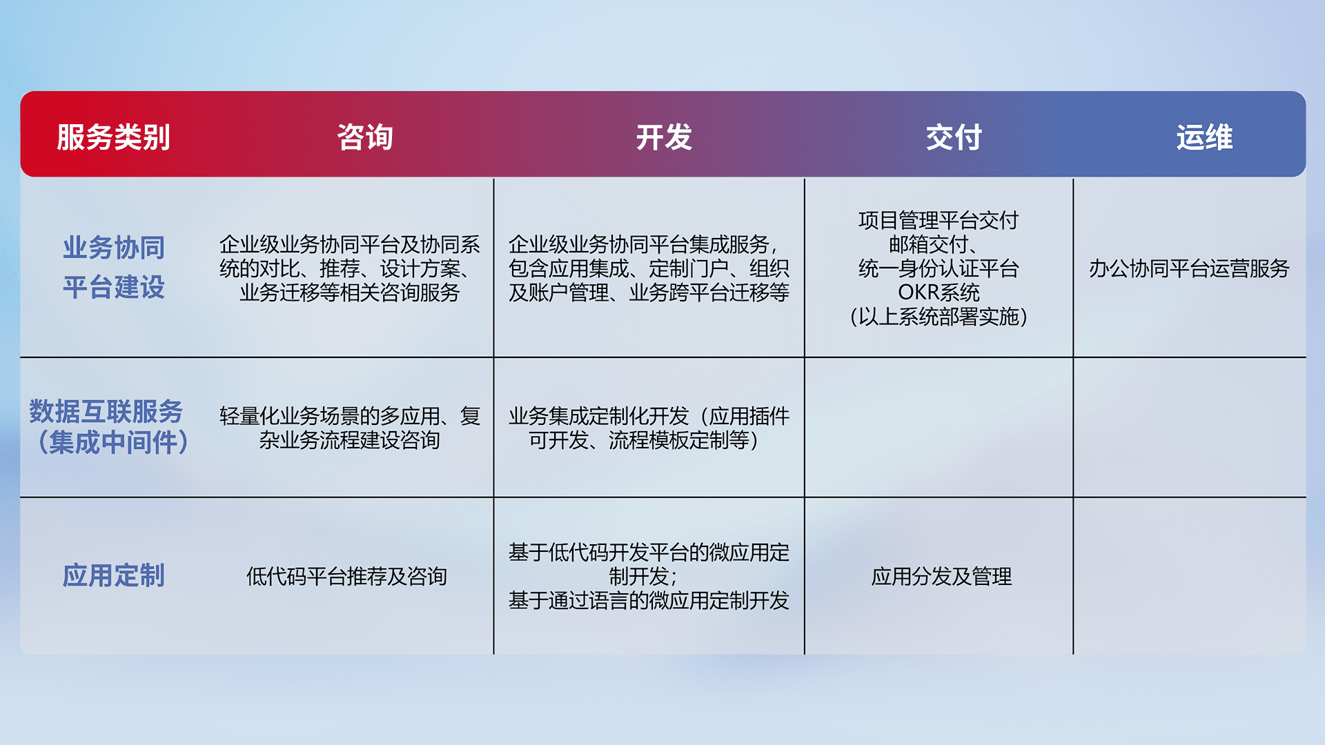 针对钉钉、、企微、、、IDaas等平台级产品提供产品的规划、、方案、、、、交付、、定制化开发等服务,,,实现如统一协同办公、、、、智能客户服务、、、、混合会议管理、、、、智能数据查询、、、、等业务场景,,实现数字化转型。。。。