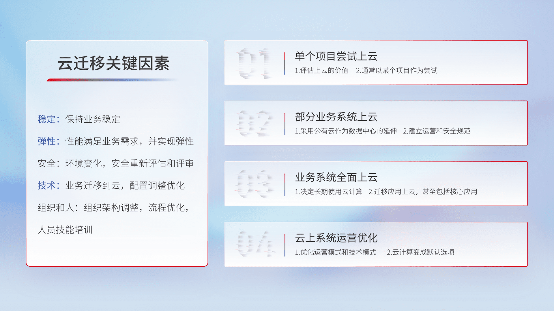 结合实际业务,,,从规划设计、、、云平台选型、、、、云原生改造、、数据迁移、、集成交付,,,迁移全过程为客户识别最佳上云路径,,做好风险识别管理,,,,设计网络架构、、身份权限、、安全审计合规、、操作审计、、日志审计、、、监控告警策略、、多站点容灾设计等,,,,对云上基础设施进行整体规划,,,提升IT治理水平,,,以满足弹性、、、、高可用、、高性能的需求。。