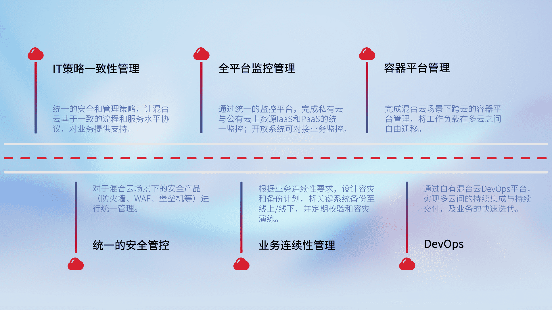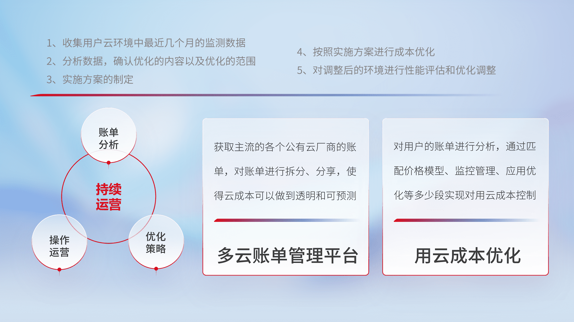 通过多云纳管,,,以统一的资源数据模型把客户的云资源进行抽象和封装,,进而实现对多云资源的统一操作,,,保障云资源管理的可靠性、、、、稳定性与可用性。。。量身定制化运维内容,,配置、、、开发运维、、、补丁管理、、、备份、、监控、、、认证和访问管理、、、审计和日常巡检等,,保障在用云过程中的可靠度,,,稳定度以及高可用率。。。。